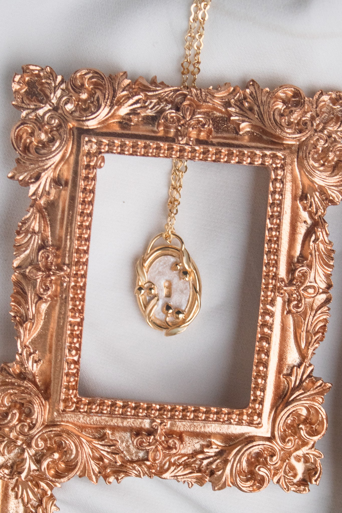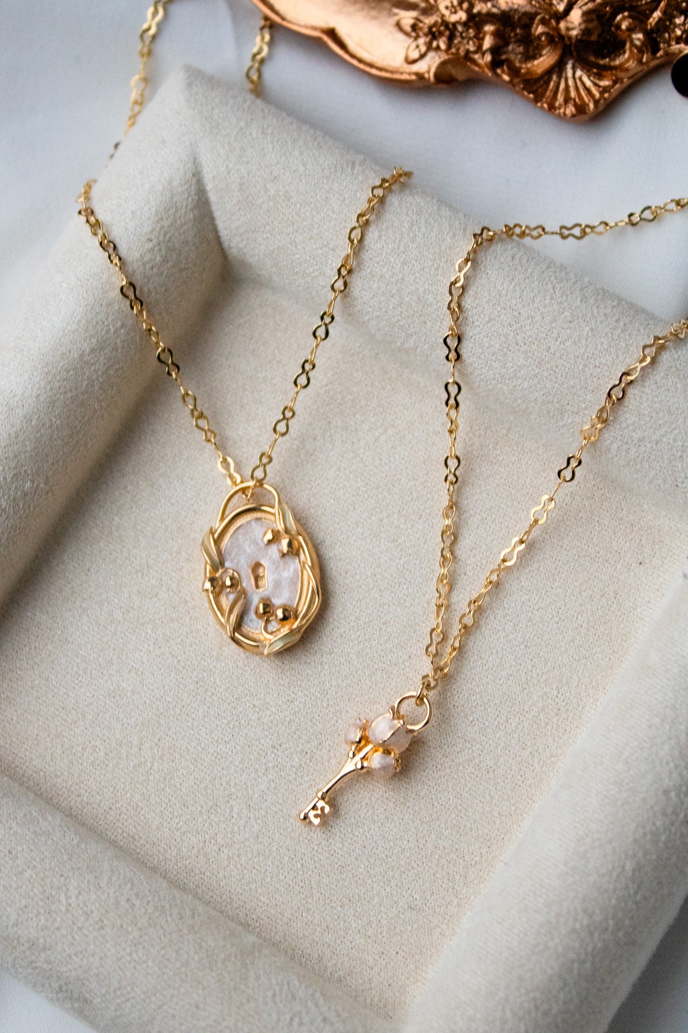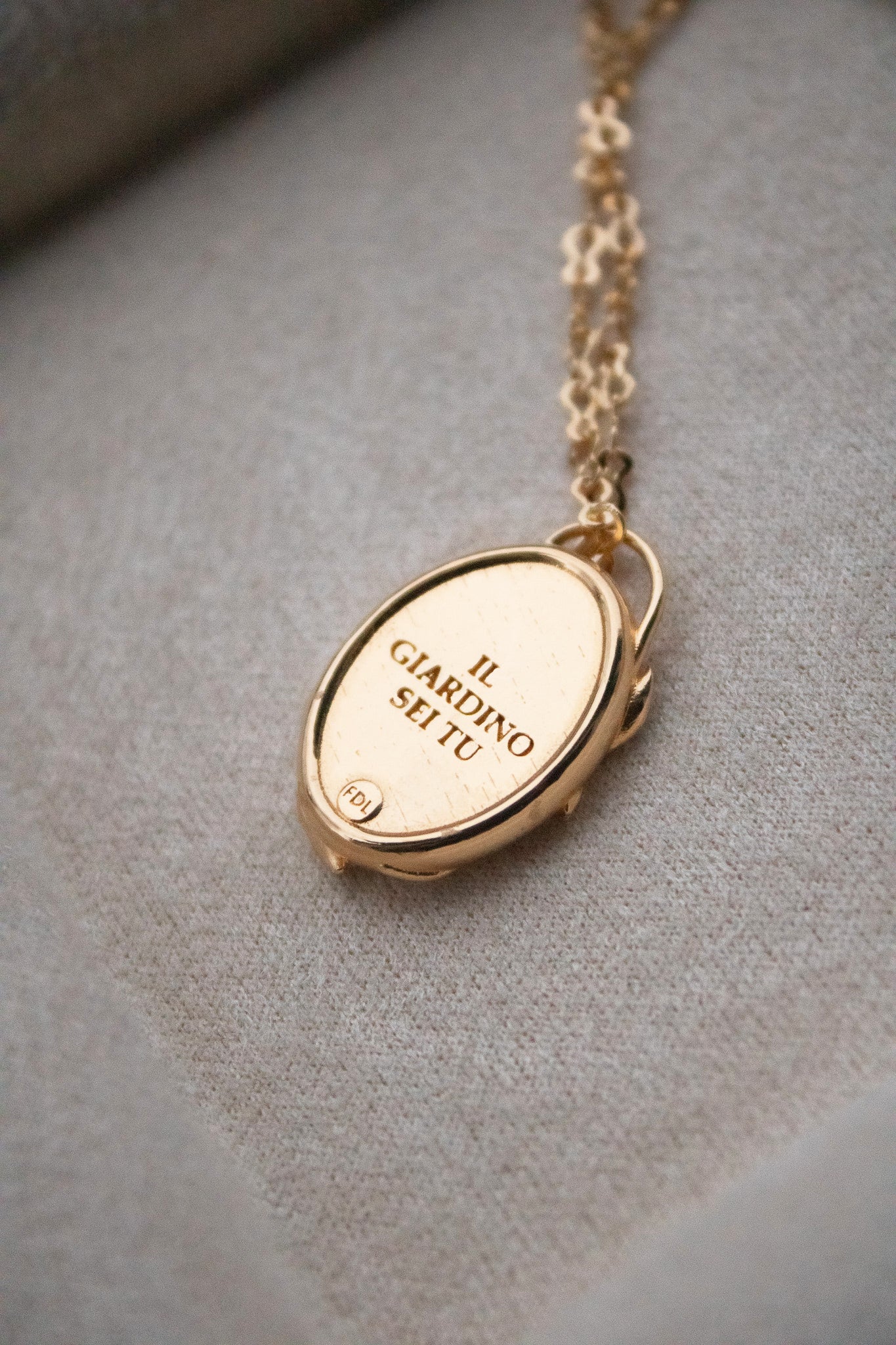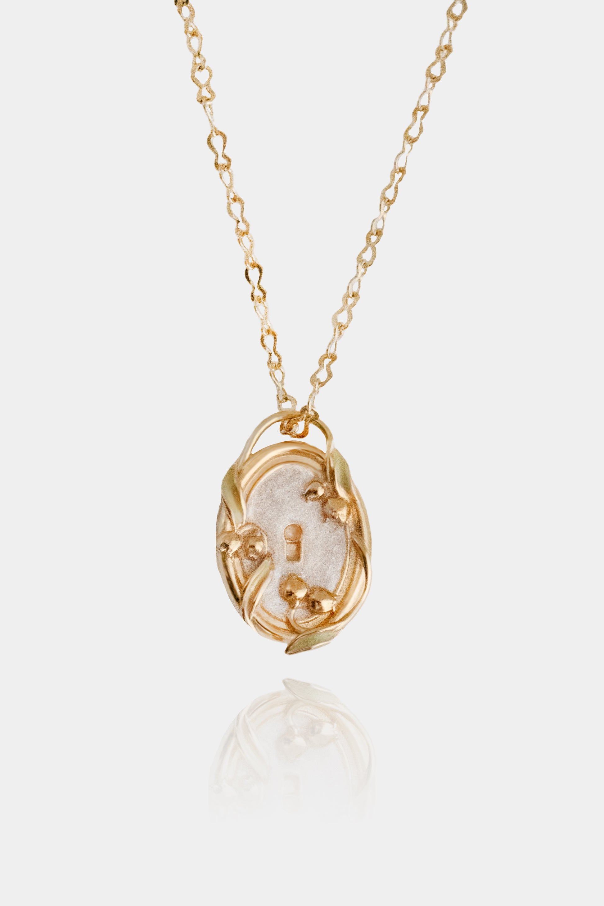 - Medaglione-Serratura circondato da piccoli mughetti. Sul retro la frase: "Il giardino sei tu".